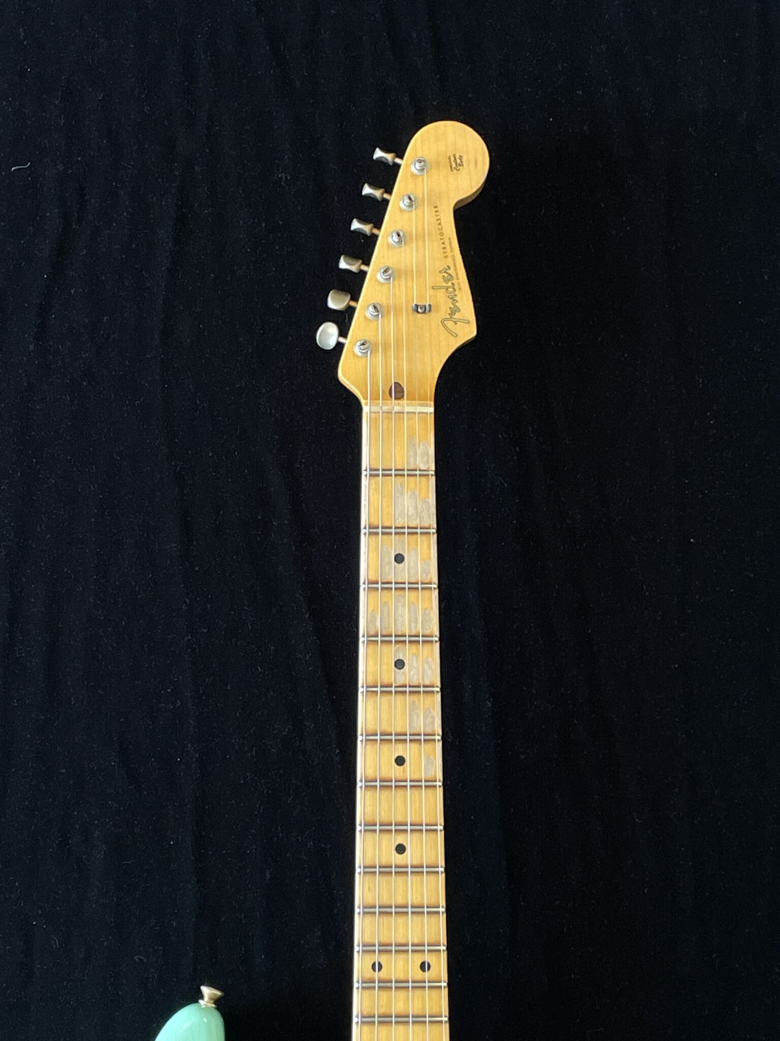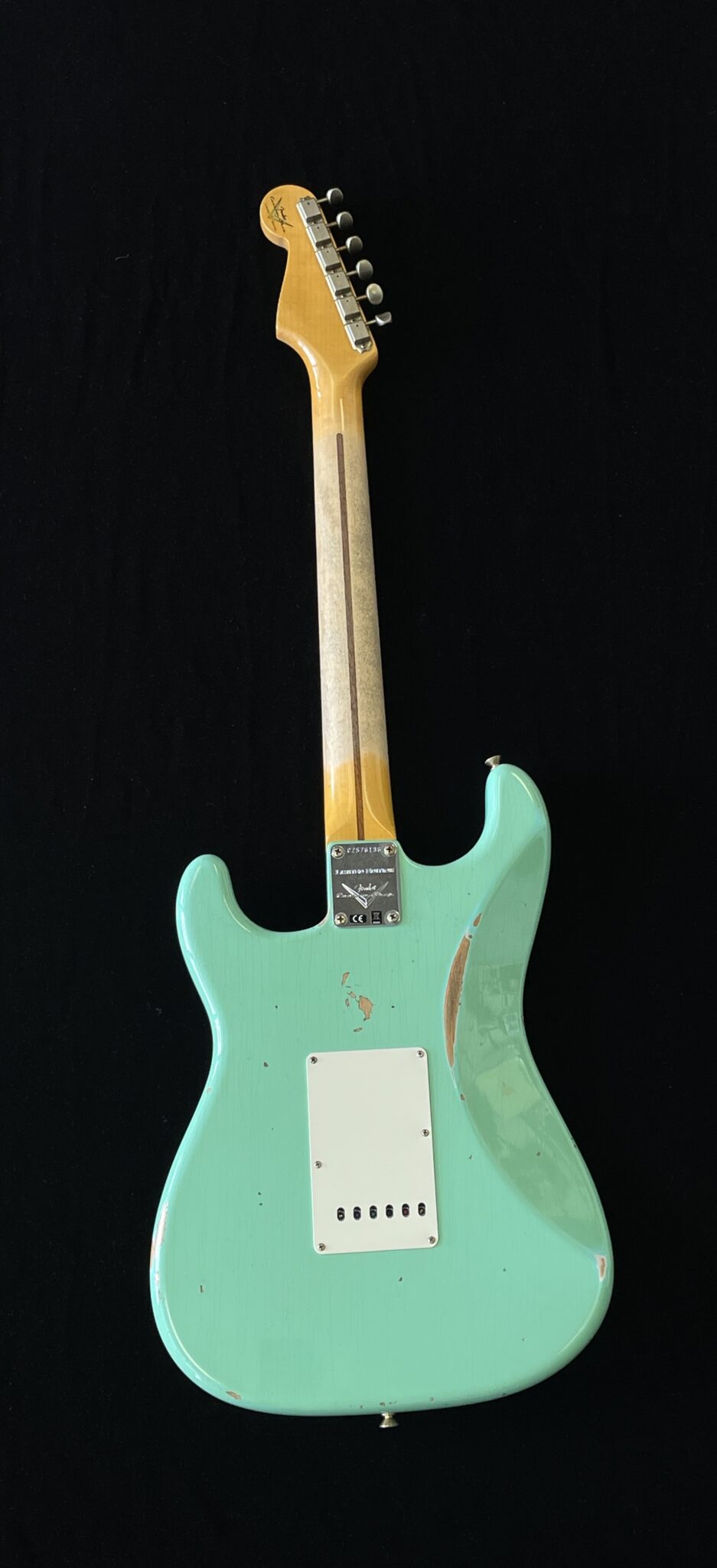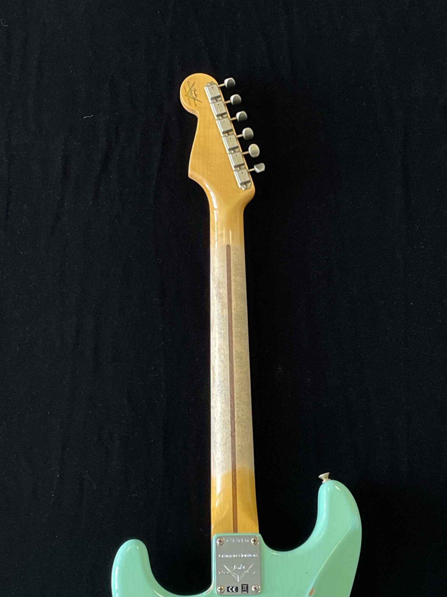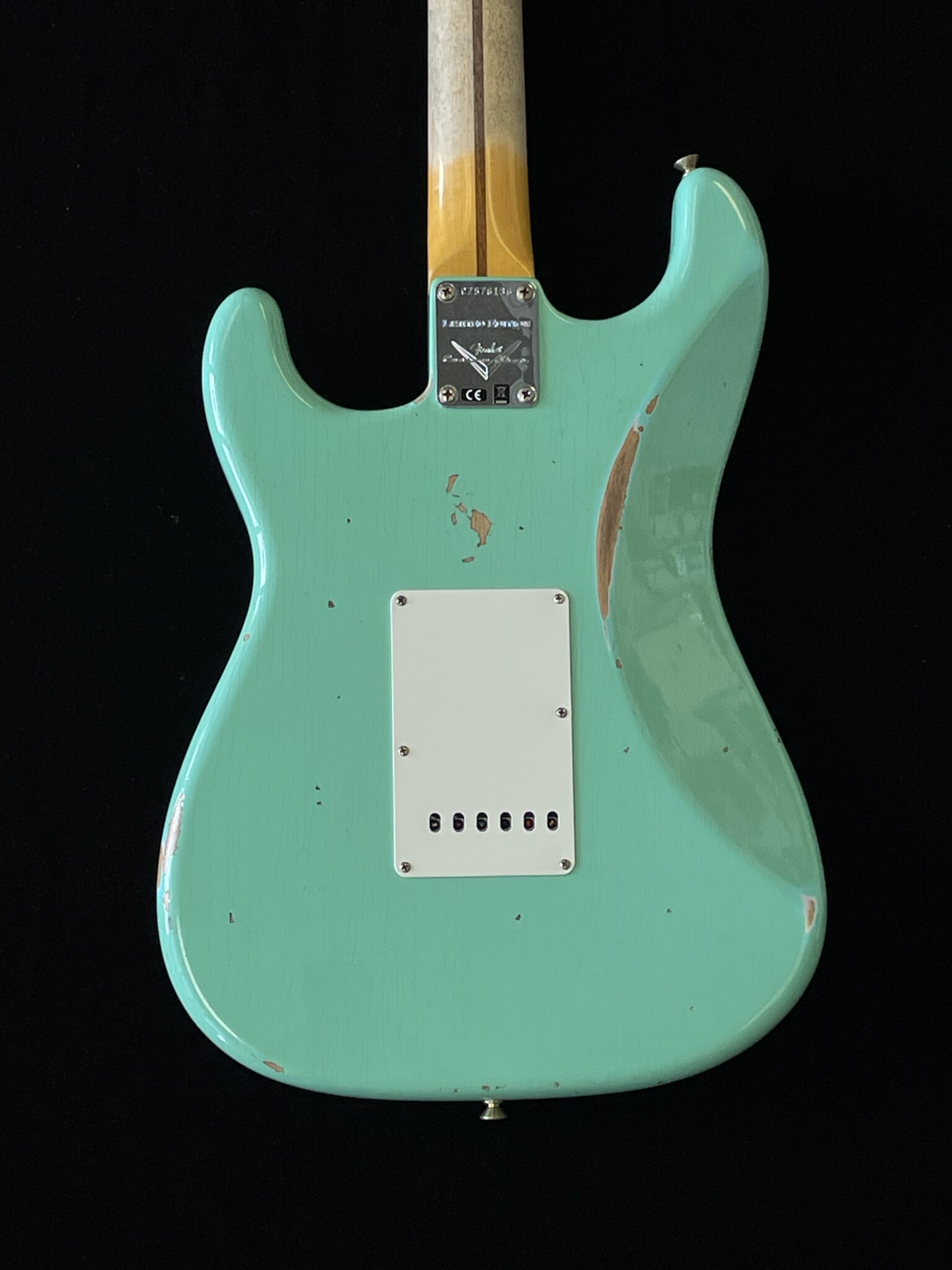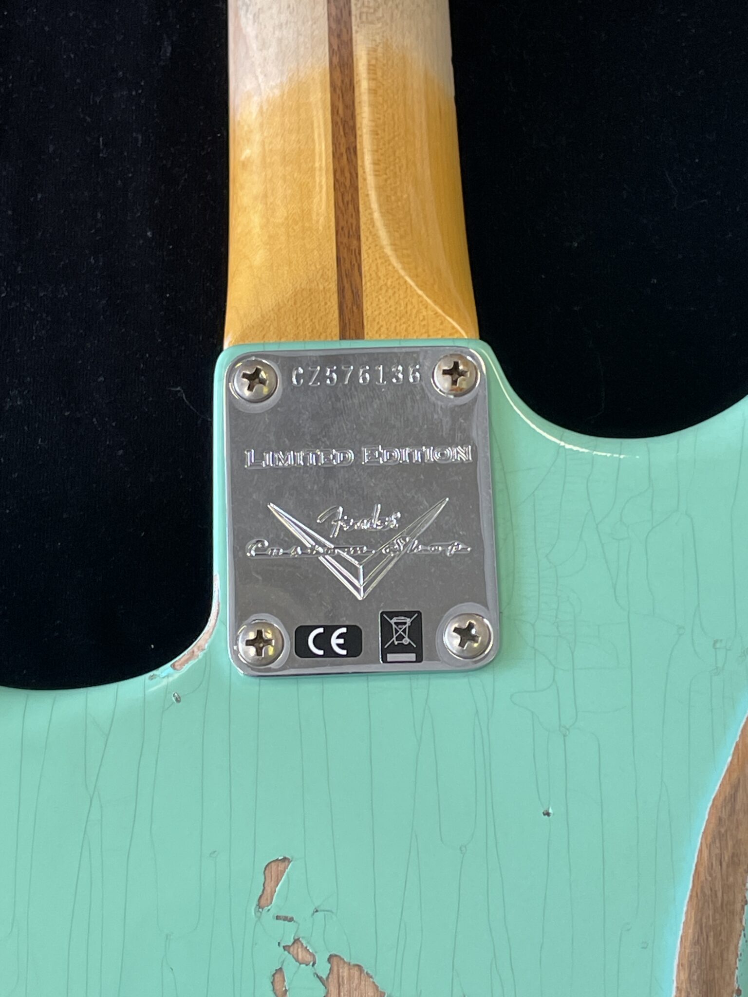 Woody’s Music of Tega Cay has a USED Fender Custom Shop 2023 Limited Fat 50’s Relic Stratocaster Sea Foam Green in mint condition for sale.